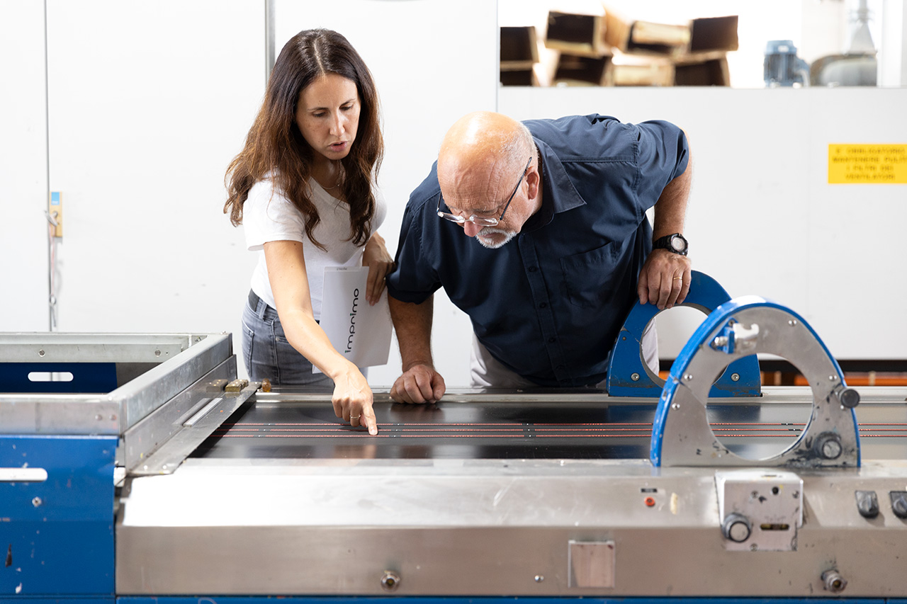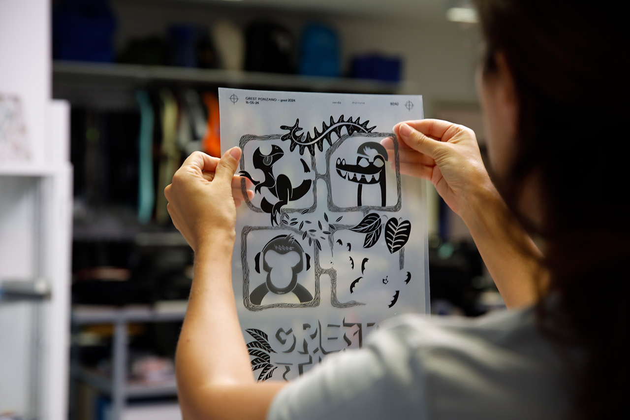 Nel 1991 ci trasferiamo a Povegliano e, grazie all’acquisto di un macchinario dalle dimensioni importanti, iniziamo a stampare grafiche su tessuti in rotoli che arrivano fino a un’altezza di 2.20 metri e fino a 6 colori. Non più solo capi tagliati dunque, con l’obiettivo di ampliare l’offerta di un servizio nelle possibilità di realizzazione.